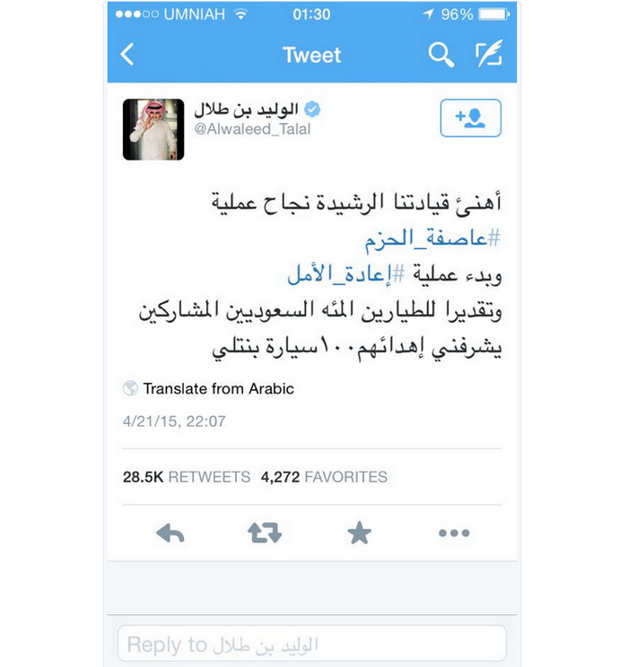 "Сакам да им се заблагодарам на пилотите кои учествуваа во операцијата во Јемен, и почестен сум што можам да понудам 100 "Бентлија" за 100 саудиски пилоти", стои во пораката на Ал-Валеед бин Талал.