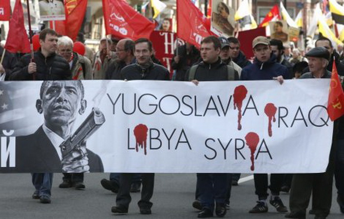 Тие носеле плакати со ликот на американскиот претседател Барак Обама, кој во раката држи пиштол, а покрај него биле напишани имињата на повеќе држави - Југославија, Ирак, Сирија и Либија, со крвави дамки.