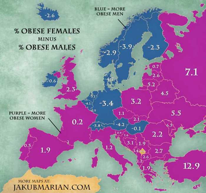Што се однесува до половите, погледнете ја статистиката и од овој аспект. Розовите подрачја на мапата претставуваат области во кои има повеќе гојазни жени, а сината каде што доминираат гојазни мажи.