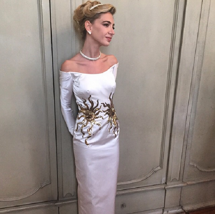 Наместо вел, дизајнерката носела наметка со капуљача на која рачно со злато бил извезен мотив на сонце. Истиот мотив се наоѓал на венчаницата и на чевлите од брендот Olympia. Од модни додатоци, невестата одбрала дијамантски ѓердан, обетки и тијара.